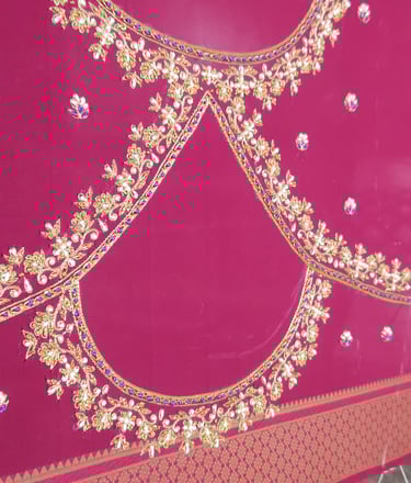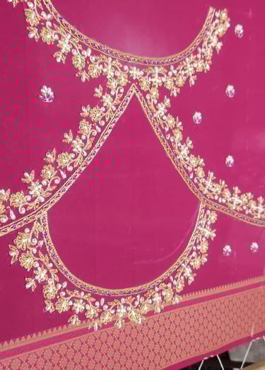Blouse fabrics like silk, cotton-silk, raw silk, velvet, and georgette are commonly used for Aari embroidery. Make sure the fabric is tightly woven and can hold the embroidery well without puckering.
